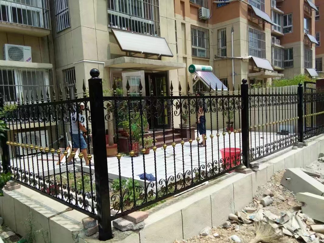 圍欄由黑色金屬制成,設計精美,帶有金色的裝飾點綴,顯得非常典雅。圍欄的柱子頂部是圓形的,增加了整體的美觀度。