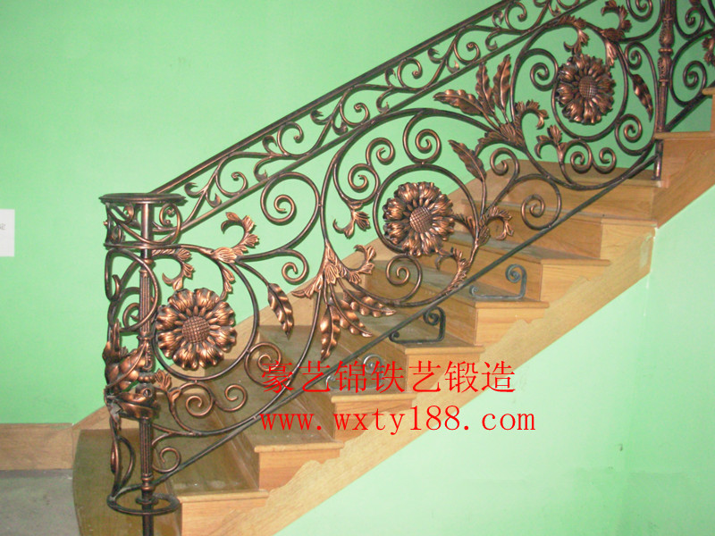 欄桿上有多個(gè)大型的花朵圖案,這些花朵圖案看起來像是向日葵,花瓣呈現(xiàn)出自然的卷曲形態(tài),栩栩如生。欄桿的扶手部分也有精致的花紋設(shè)計(jì),與整體風(fēng)格相協(xié)調(diào)。