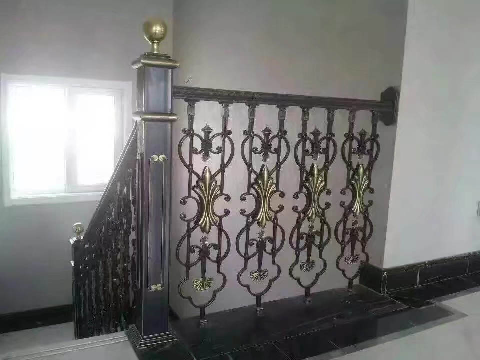 欄桿的設計非常華麗,采用了復雜的卷曲花紋和裝飾圖案。欄桿的顏色為深棕色,帶有金色的裝飾細節,增加了整體的豪華感。